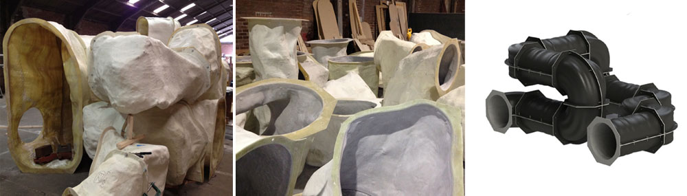 Each section comprises of two pieces that bolt together to make a metre section of cave (straight, 90 degrees or 45 degrees). By using an octagonal flange to connect each section there are 8 different ways to connect each piece being able to rotate them 45 degrees.